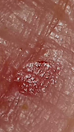 Lip of 3-year-old male at 10x showing fibers embedded in skin.