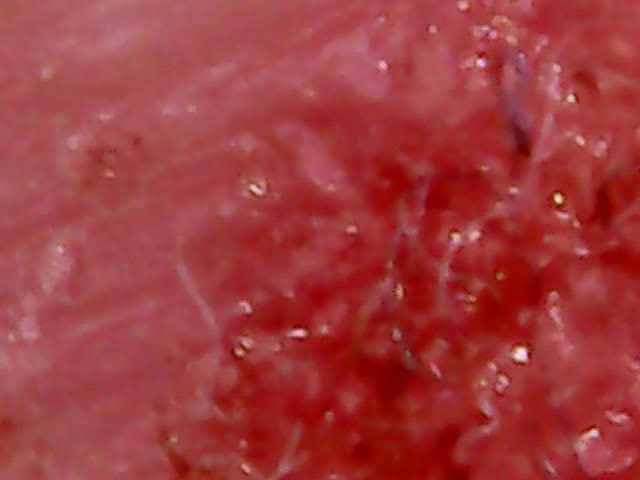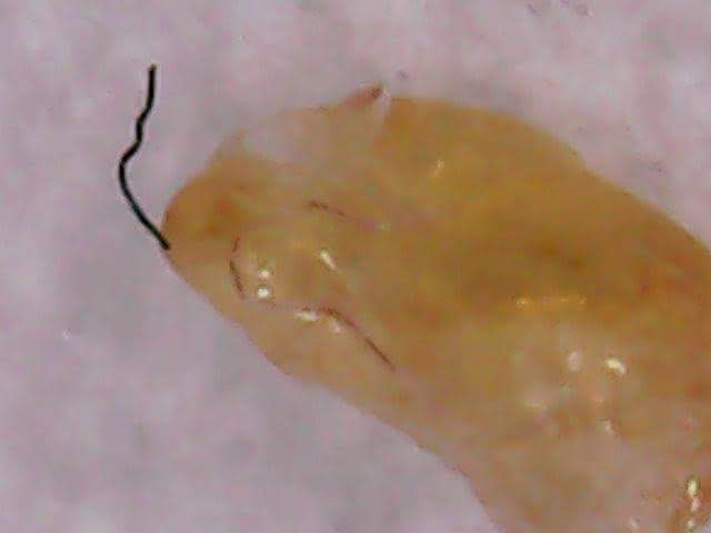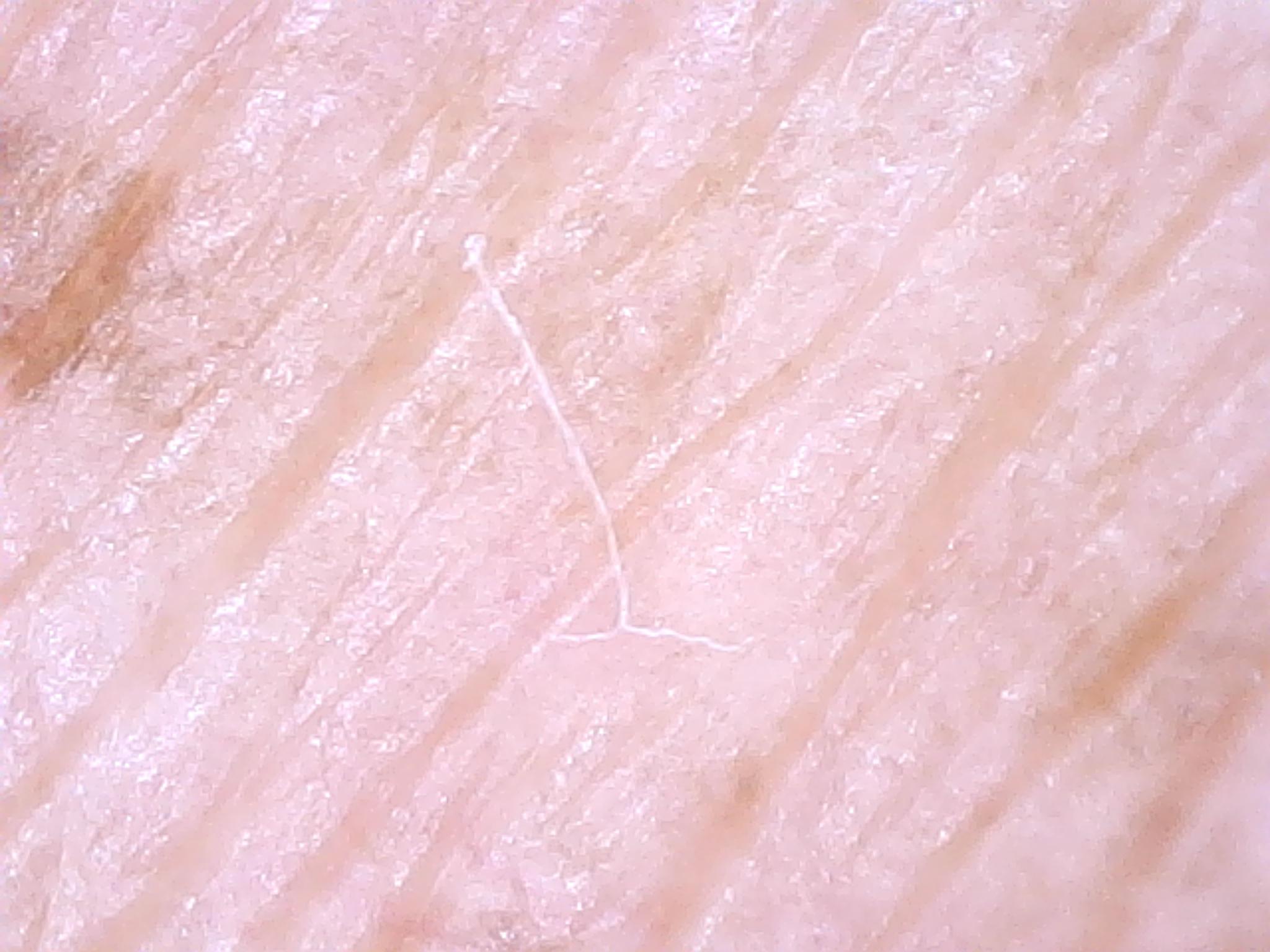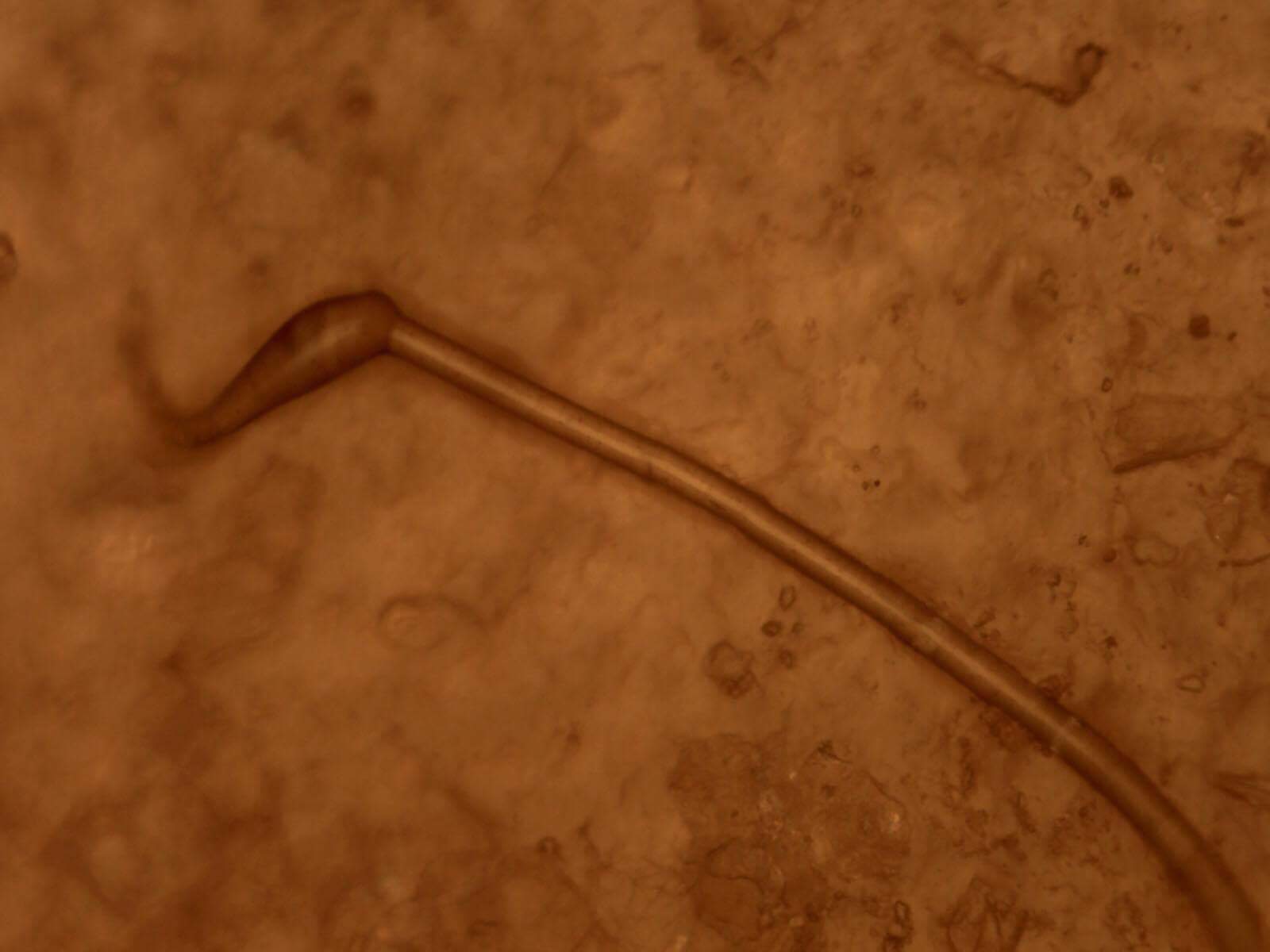 Image sequence 9 of Morgellons patient. Outline area magnified 60x – note hair in foreground.