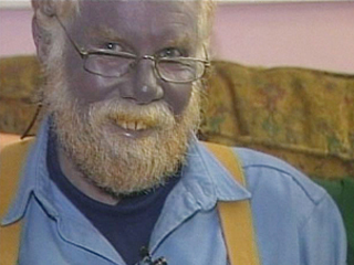 First of all, the man is really blue. I mean really blue. When people contract argyria (i.e., skin graying) from ingesting excessive amounts of colloidal silver over long periods of time, they usually turn grey, not blue. That’s because the excessive silver buildup in their body has worked its way to the skin (the human body’s largest organ of elimination), and when the sun strikes the skin it tarnishes the large number of silver particles lodged there, turning the skin slate grey.